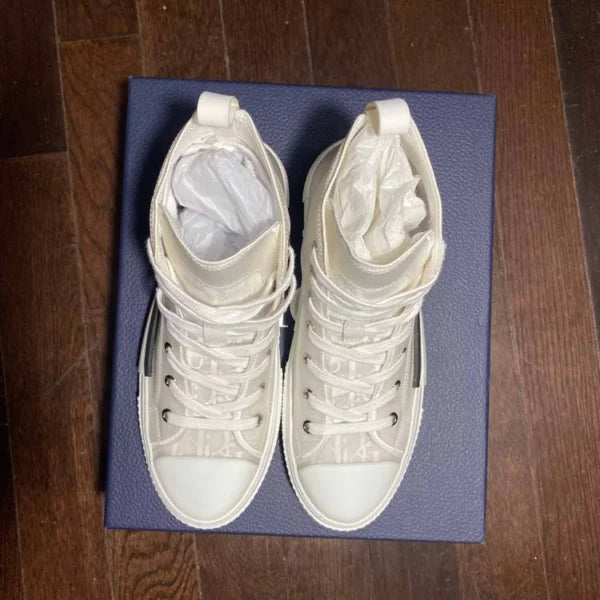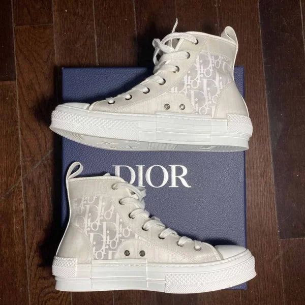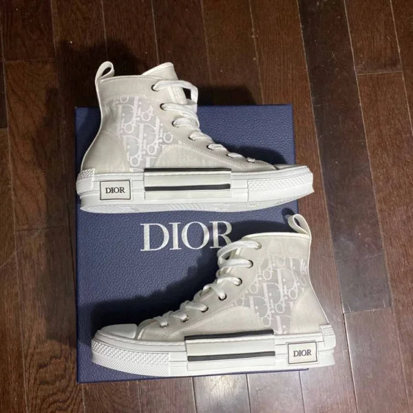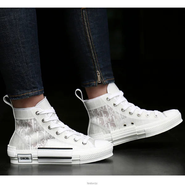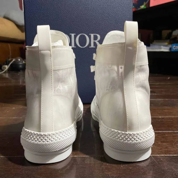 The B23 League high-top sneaker is set apart by its layering of transparent paneling and white and black Dior Oblique canvas. Essential details, such as eyelets and a lace-up front, a white rubber sole, a rounded and reinforced toe as well as a rear tab recall the codes of the classic high-top style. The sneaker is further enhanced with contrasting details on the sides, including a Dior signature, and pairs easily with any casual outfit.
